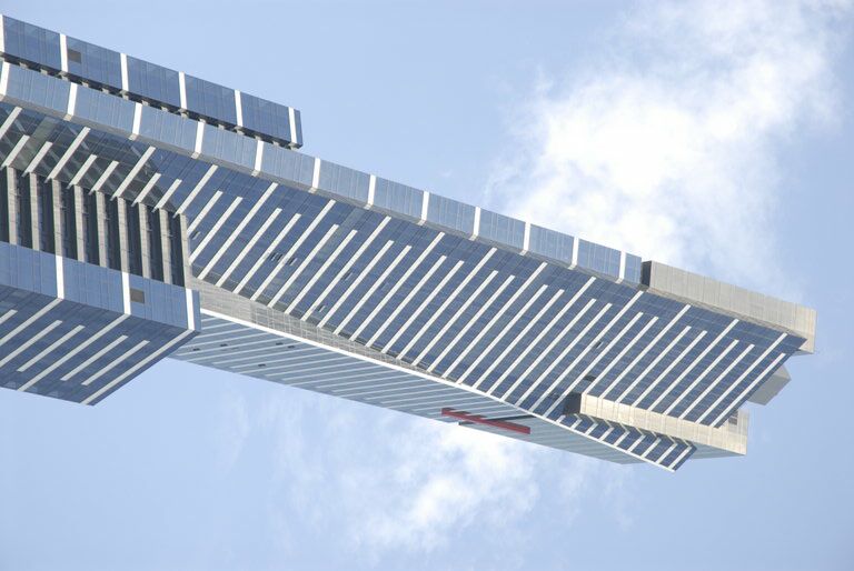 Slim, tall and angular, Eureka stands like an elegant catwalk model overlooking the River Yarra in Melbourne's smart Southbank area. Cleverly, it presents a different silhouette depending from which side you look at it. Also, like a model, it is both cool and striking, with smooth, glacial façades of glass broken up with sassy horizontal stripes of white.